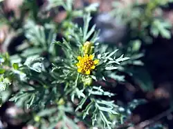 Fetid marigold is an erect, multi-branching annual with a large taproot, common to anthropogenically disturbed areas such as roadsides, fields, and meadows, at elevations from 3000–6500 ft (914–1981 m).[3][4][5] Its height is 4–16 inches (5–70 cm). The leaves are simple and opposite, 3/4 in to 2 in (15–50 mm) long and linearly lobate.[6]