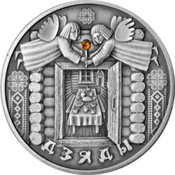 Dziady[a] (lit. "grandfathers, eldfathers", sometimes translated as Forefathers' Eve) is a term in Slavic folklore for the spirits of the ancestors and a collection of pre-Christian rites, rituals and customs that were dedicated to them. The essence of these rituals was the "communion of the living with the dead", namely, the establishment of relationships with the souls of the ancestors, periodically returning to their headquarters from the times of their lives.[2] The aim of the ritual activities was to win the favor of the deceased, who were considered to be caretakers in the sphere of fertility. The name "dziady" was used in particular dialects mainly in Belarus, Poland, Polesia, Russia, and Ukraine (sometimes also in border areas, e.g. Podlachia, Smoleńsk Oblast, Aukštaitija), but under different other names (pomynky, przewody, radonitsa, zaduszki) there were very similar ritual practices, common among Slavs and Balts, and also in many European and even non-European cultures.[3]