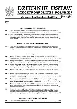 According to Article 122 of the Constitution of Poland of 1997, "The President of the Republic shall sign a bill within 21 days of its submission and shall order its promulgation in the Journal of Laws of the Republic of Poland (Dziennik Ustaw)".[1] The matter is further regulated by articles 87 and 234 of the constitution, as well as by the Article 9 of the Act on Publishing Normative Acts and Several Other Legal Acts of 2000. Dziennik Ustaw includes such documents as: