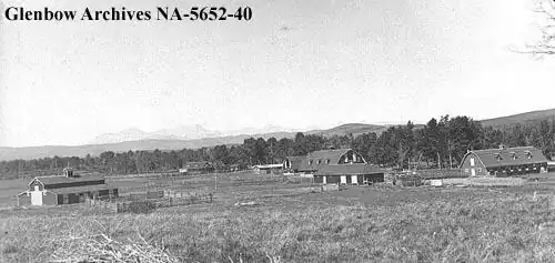 In 1884, Mrs. A. K. Bedingfield and her son Frank Bedingfield moved from the United Kingdom to the Pekisko region of the North-West Territories' District of Alberta to start a ranch. In 1886, Frank and Mrs. Bedingfield applied for homesteads on adjacent quarters of land.[1] As a widow, Bedingfield was eligible to apply for a homestead.[2] While improving their homesteads and ranch lands, Frank worked for the adjacent Bar U Ranch, before eventually starting to acquire his own herd of cattle and enlarging the family's land holdings.[3] At its peak, the family owned over 5.8 km2 (1,440 acres) of land and held the grazing rights to a further 160 km2 (40,000 acres).[4] In addition to cattle, the Bedingfields raised and bred Percheron and Clydesdale horses.