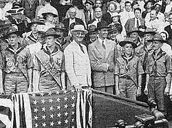 In early July 1937, the BSA held its first national Scout jamboree in Washington, D. C., attended by 25,000 Scouts and Scouters. In addition to overseeing the innovative event itself, Goodman's public relations service did yeoman work to ensure extensive news media coverage. A jamboree press tent accommodated 626 news media reporters, photographers, and broadcasters. Sixty-four news releases were issued and the public relations service assisted in the making of 11 newsreels and 53 magazine articles.[11] The three major U.S. radio networks of the time, NBC, CBS and Mutual, all set up complete broadcasting studios near the jamboree headquarters to produce almost 19 hours of live, on-site jamboree coverage broadcast coast-to-coast. Celebrities also visited the jamboree, including well-known broadcaster Lowell Thomas and U.S. President Franklin D. Roosevelt. While at the jamboree, Scouts also attended a three-game baseball series between the Washington Senators and the Boston Red Sox at Griffith Stadium, with Goodman arranging for Eagle Scouts to have a place of honor with President Roosevelt in the stands (pictured).[11]