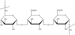Pullulan is a polysaccharide consisting of maltotriose units, also known as α-1,4- ;α-1,6-glucan'. Three glucose units in maltotriose are connected by an α-1,4 glycosidic bond, whereas consecutive maltotriose units are connected to each other by an α-1,6 glycosidic bond. Pullulan is produced from starch by the fungus Aureobasidium pullulans. Pullulan is mainly used by the cell to resist desiccation and predation. The presence of this polysaccharide also facilitates diffusion of molecules both into and out of the cell.[1]