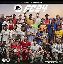 The cover for the Standard Edition of the game features Manchester City striker Erling Haaland. The cover for Ultimate Edition of the game features 31 iconic current and former players from around the world[5] in a style akin to the cover of the album Sgt. Pepper's Lonely Hearts Club Band.[6] Among the notable figures are Sam Kerr, Virgil van Dijk, Son Heung-min, Zinedine Zidane, Pelé and David Beckham.[3][7]