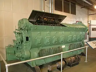 ![]() An EMD 16-567B on display at the North Carolina Transportation Museum. Shown in the foreground is an exploded power assembly, with the piston, piston carrier and piston rod (fork type) on the left, and the cylinder liner and cylinder head on the right. | |
