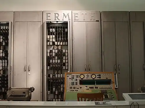 In 1955, Heinz Rutishauser became an associate professor at the ETH Zurich and Ambros Speiser left to the industry, becoming the founding director of the IBM Zurich Research Laboratory in Rüschlikon. From there on, the completion of the ERMETH was supervised by Peter Läuchli and Alfred Schai.[1] With various technical and financial setbacks, the ERMETH was built up as a one-off unit from 1955 onwards and gradually put into operation from 1956 onwards; it performed its task until October 1963, when it was dismantled and packed. A planned licensed version of ERMETH by a private company did not come about.[2] After spatial alterations a CDC 1604A of Control Data Corporation took its place from April 1964. The available computing power at ETH increased by a factor of 100 with the transition from the electromechanical Z4 to the ERMETH, but by a factor of 400 with the transition from the ERMETH with its time-critical magnetic drum memory to the fully electronic CDC 1604A.