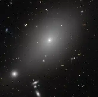The galaxy is situated alone in a volume of space about it. It is theorized that the galaxy cannibalized its nearest companions, hence, being a fossil group.[5] The galaxy is a giant elliptical of type cD3[2] (E+3), one of the largest types of galaxies.