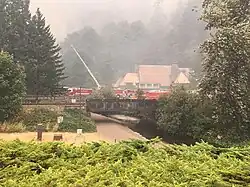 The community of Cascade Locks, Oregon was the first to experience mandatory evacuations, with 283 structures, including 15 businesses, being threatened by the fire. Salmon hatcheries at Cascade Locks were forced to release 600,000 fish six months earlier than expected.[16] The fire also threatened historic structures in the Eagle Creek Day Use Area, specifically those built by the Civilian Conservation Corps in the 1930s.[17] The fire also threatened the Multnomah Falls Lodge, which was saved by water tenders.[18]
