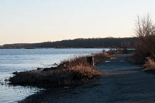 Clockwise from upper left: The park in October 2009, American white pelicans flying at the park's bird sanctuary, deer grazing in the park, a picnic shelter and directional sign, and a lakeside trail. |