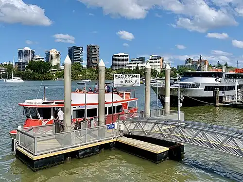 Eagle Street Pier ferry wharf was located on the northern side of the Brisbane River serving the Brisbane central business district in Queensland, Australia. It was served by Transdev Brisbane Ferries' CityHopper service and a cross-river service to Kangaroo Point (to the Holman Street and Thornton Street ferry terminals).[1][2][3] These services were suspended in July 2020 and formally cancelled to stop at this wharf in October 2020.[4]