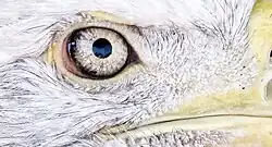 Eagles have upper and lower eyelids, the bottom lid is more mobile and gives the appearance of the eyelid blinking from bottom to top. Inside the eyelids are made up of connective tissue called fibroelastic plate (tarsus) that function to support the outer eyelid and give it shape. On the eyelids are small hair like feathers called filo-plumes that are comparable to human eyelashes. Eagles have a third eyelid also known as a nictitating membrane,[11] which "grows in the inner corner of the eye, next to the tear duct". Eagle tears "produced by the lacrimal gland and Hardarian gland" moisten the eyes and contain the chemical lysozyme which protects against salt water and also destroys bacteria, thus preventing eye infections. The nictitating membrane is a thin semi-transparent piece of skin that acts a sweeping wiper moving laterally across the eye [2] controlled by the quadratus muscle. The third eyelid also acts as a mechanism to remove "dust and dirt from the cornea".[12] The eagle iris is a pale yellow color, much lighter than human eyes. Both eagles and humans have a white area called the sclera, but in the case of eagles, it is hidden below the eyelid. Eyelid openings are oval-shaped in humans, while they are round in the case of birds' eyes.[2]