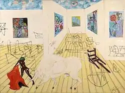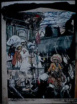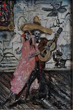Local familiarity with Mexican cultural history led to artworks which took on distinctive Mexican themes and characters and which paid tribute to the subtleties of the Mexican culture - from Lucha Libre and Mexico's love of free-wrestling to “Día de los Muertos” (Day of the Dead), which is a Mexican national holiday to celebrate, pray for, and to honor departed loved ones. Such artworks include Mays' "The Dead Dance", which conveyed the Mexican dead celebrating in skeletal forms. His “Last Train to Chihuahua”, which depicts a revolution-era train arriving at a station, received wide coverage in local newspapers,[5] and “The Birth of The Mestizo”, combine many elements of pre-Hispanic Mexican Aztec culture's encounter with the Conquistadores, and the resulting post-Hispanic Mexico - where the eagle perched on cactus devoured the snake, which today, remains a part of the Coat of arms of Mexico