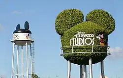 The Earffel Tower[2] is a faux water tower located at Walt Disney Studios Park at Disneyland Paris in Seine-et-Marne, and formerly at Disney's Hollywood Studios at the Walt Disney World Resort in Bay Lake, Florida, near Orlando.[3] Adorned with a set of Mickey Mouse ears, it is inspired by the real water tower located at the Walt Disney Studios in Burbank, California.[4] A pun on the Eiffel Tower, it is based on water towers commonly found on Hollywood studio backlots of the first half of the 1900s, which were originally a safety measure to douse fires on highly flammable wooden film sets. However, the Earffel Tower has never contained water.[4]