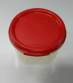 Using black, inflexible pieces of polyethylene slag, a waste product of the oil refining process given to him by his supervisor at DuPont, Tupper purified the slag and molded it to create lightweight, non-breakable containers, cups, bowls, plates, and even gas masks that were used in World War II.[3] He later designed liquid-proof, airtight lids, inspired by the secure seal of paint can lids.[4]