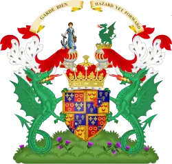 ![]() ![]() Quarterly 1st and 4th grand quarters counterquartered 1st and 4th Azure three fleur-de-lys Or (Montgomerie); 2nd and 3rd Gules three annulets Or stoned Azure (Eglinton), all within a bordure Or charged with a double treasure flory counter-flory Gules; 2nd and 3rd grand quarters counterquartered 1st and 4th Or three crescents within a double treasure flory counterflory Gules (Seton); 2nd and 3rd Azure three garbs Or (Buchan) over all an escutcheon parted per pale Gules and Azure the dexter charged with a sword in pale proper pommelled and billed Or supporting an imperial crown the sinister charged with a star of twelve points Argent, all within a double treasure flory counterflory Gold. | |