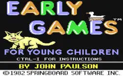 Early Games (shown as Early Games for Young Children on the title screen) is an educational video game by Counterpoint Software and Springboard Software and released for Atari 8-bit computers in 1982. It was designed by John Paulson. The game contains educational mini-games targeted at preschoolers and designed to teach basic math, language, and logic skills. It was part of the Skill Builder series, along with Fraction Factory, Match Maker, and Piece of Cake.[1][2]