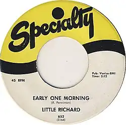 "Early One Morning" is a blues rock song written by Little Richard. It was originally released on his album The Fabulous Little Richard, and released by Specialty Records as a B-side single to "She Knows How to Rock" in November 1958.[1] The song derives from "Wee Baby Blues" by Big Joe Turner.[2] Turner's version features Ray Charles on piano, and was released as a single on Atlantic Records in 1957.[3]