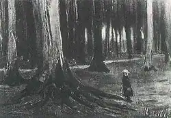 Of a study that Van Gogh made for Girl in a Wood or Girl in White in the Woods, (F8)[35] he remarked at how much he enjoyed the work and explains how he wishes to trigger the audience's senses and how they may experience the painting: "The other study in the wood is of some large green beech trunks on a stretch of ground covered with dry sticks, and the little figure of a girl in white. There was the great difficulty of keeping it clear, and of getting space between the trunks standing at different distances - and the place and relative bulk of those trunks change with the perspective - to make it so that one can breathe and walk around in it, and to make you smell the fragrance of the wood."[36]