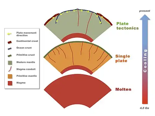 Earth's internal heat travels along geothermal gradients and powers most geological processes.[3] It drives mantle convection, plate tectonics, mountain building, rock metamorphism, and volcanism.[2] Convective heat transfer within the planet's high-temperature metallic core is also theorized to sustain a geodynamo which generates Earth's magnetic field.[4][5][6]