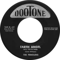 "Earth Angel", occasionally referred to as "Earth Angel (Will You Be Mine)", is a song by American doo-wop group the Penguins. Produced by Dootsie Williams, it was released as their debut single in October 1954 on Dootone Records. The Penguins had formed the year prior and recorded the song as a demo in a garage in South Central Los Angeles. The song's origins lie in multiple different sources, among them songs by Jesse Belvin, Patti Page, and the Hollywood Flames. Its authorship was the subject of a bitter legal dispute with Williams in the years following its release.