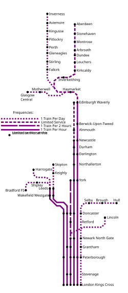 This was East Coast's flagship route, serving the whole length of the East Coast Main Line; an hourly service from London to Edinburgh Waverley, calling at York, Darlington, Newcastle, Berwick-upon-Tweed and Edinburgh. Some of these trains also called at Peterborough. Occasionally there was a half-hourly service to Edinburgh with some Newcastle trains extended at peak hours. At weekends all services on the half-hour continued to Edinburgh from Newcastle.[35]