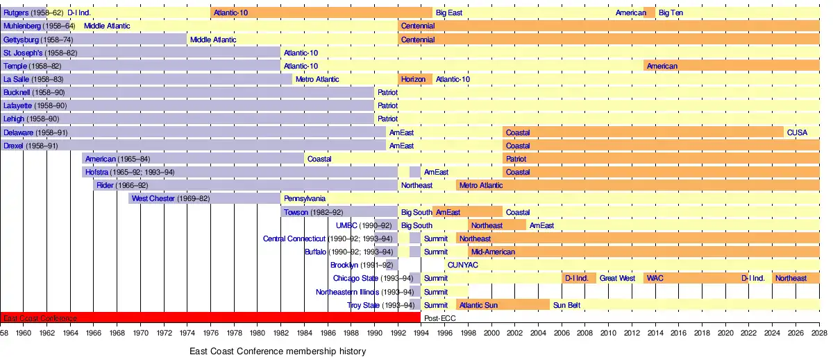 The East Coast Conference was a college athletic conference at the Division I of the National Collegiate Athletic Association (NCAA). It was founded as the university division of the Middle Atlantic Conferences (MAC) in 1958. The MAC consisted of over 30 teams at that time, making it impossible to organize full league schedules in sports like football, basketball, and baseball. In 1958, the larger schools created their own mini conference, consisting of 11 members (7 for football).