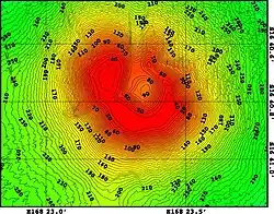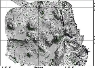 ![]() Shaded relief map of the Epi caldera; Epi-A, Epi-B and Epi-C are marked. | |