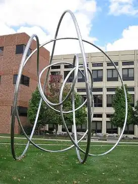 East Gate/West Gate was made by Sasson Soffer in 1973. It is a three-dimensional outdoor sculpture consisting of two spirals welded and bolted together. It is secured to the ground by steel clamps. Four holes were drilled and filled with concrete and then affixed.[1] It is made of stainless steel pipe and is 24' x 40' x 30' in dimension. Installation of this piece occurred on March 22, 2009. It was moved from the Indianapolis Museum of Art and transported via helicopter to its current location on campus in front of the University Library.[3] It is on loan from the Indianapolis Museum of Art until 2011.[4]