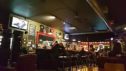 East Glisan Pizza Lounge is a pizzeria on Glisan Street in the northeast Portland part of the Montavilla neighborhood. Willamette Week's Martin Cizmar said of the interior and atmosphere: "The dimly lit East Glisan is indeed a lounge. Roughly half the seating is bar stools or couches, and the front sidewalk is home to a fleet of those rugged wooden picnic tables where smokers huddle outside Portland dive bars. It's all '90s classics on the radio: early Wilco and Liz Phair, midcareer Whitney Houston and Tina Turner."[2]