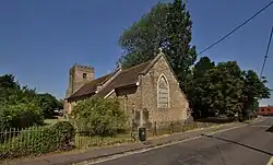Nikolaus Pevsner takes this to mean that the north chapel was built early in the 15th century, which surprised him as its Decorated Gothic style had been succeeded by Perpendicular Gothic around 1350.[3] However, the south aisle and south chapel were rebuilt in the Perpendicular Gothic style early in the 15th century so Page and Ditchfield conclude that the brasses of Clarice Windsor and John York were formerly in the south chapel and moved at a later date.[3] The south chapel has a squint into the chancel.[2] The chapel was re-roofed in the 17th century.[3] The arch supporting the west bell tower is 14th-century Decorated Gothic but the style of the rest of the tower is Perpendicular Gothic.[2][3] A Perpendicular Gothic clerestory was added to the nave in the 15th century. The east window of the chancel is also Perpendicular, from late in the 15th century.[2] St Andrew's is a Grade I listed building.