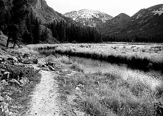 The East Inlet Trail in Rocky Mountain National Park, Colorado, was established in 1913 to provide access from Grand Lake to a series of lakes 6 miles (9.7 km) to the east of Grand Lake. The trail originates at the east stream inlet to Grand lake: confusingly, it is close to the west portal of the Alva B. Adams Tunnel which conveys water from the west side of the Continental Divide under the park to the east slope of the Rocky Mountains. The trail was developed further in the 1920s, but was still considered to be in poor condition. In the 1930s further improvements were made, and in 1934 workers from the Public Works Administration rebuilt the section between Lone Pine Lake and Lake Verna. In 1940 workers from the Civilian Conservation Corps improved three miles (4.8 km) of trail beyond Adam Falls, building causeway sections through swampy areas. The trail was rebuilt again in 1970, and was improved between 2000 and 2003 with stone steps and handrails at Adam Falls.[2]