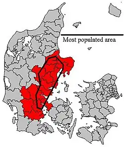 With about 1.4 million people living in the area, it represents approximately 25% of the population of Denmark.[6] The area has 19 municipalities as of 2016.[7]