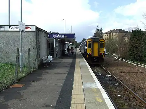 There is a daily half-hourly service (including Sundays) north-west to Glasgow Central with extra journeys during weekday peak periods. The average journey time to Glasgow Central is 30 minutes.[6] The earliest train leaving the station is at 06:18 Monday to Friday, and 08:26 on Sundays. The last train to arrive at the station is at 23:50.[7]