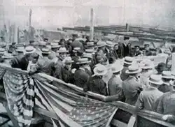 When Lindsay arrived he was met by a mob of 2,000 people outside the synagogue, who shouted "Lindsay must go" and "we want Shanker". Halpern admonished the protesters, asking "Is this the exemplification of the Jewish faith?", but many replied "yes".[26] Lindsay was heckled off the podium by the audience inside, and his limousine was "pounded on" and "pelted with trash" by the mob outside (which had grown to 5,000) as he drove away.[27] The strike, which was marked by "threats of violence and diatribes laced with racism and anti-Semitism", ended when the New York legislature suspended the administrator and the board.[25]