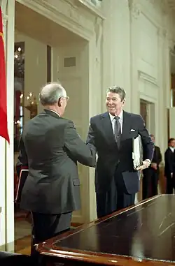- ^ Shipler, David K. (December 9, 1987). "Reagan and Gorbachev Sign Missile Treaty and Vow to Work for Greater Reductions". The New York Times.