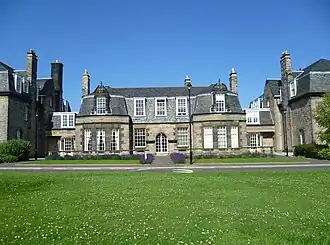 The architect selected was Alan Keith Robertson (1881–1925), architect to the Scottish Education Department. Thomas Swann, (1883–1925), Robertson's partner in the firm, had previously worked with Sir Robert Lorimer and the new halls of residence were designed in the Arts and Crafts style popularised by Lorimer. The three halls had mansard roofs and were grouped around a large grassed quadrangle, similar to the design of campus buildings at McGill University, Montreal designed by another Scottish Lorimer trainee, Percy Erskine Nobbs.[4] The design was 3-storey, symmetrical, 15-bay U-plan block. with the first and second storeys recessed.[5] The front and side elevations were constructed from stone from Craigleith Quarry and the rear elevations finished in brickwork and harling.[3]