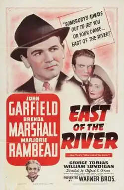 East of the River is a 1940 American drama film directed by Alfred E. Green and written by Fred Niblo, Jr. The film stars John Garfield, Brenda Marshall, Marjorie Rambeau, George Tobias, William Lundigan and Moroni Olsen. The film was released by Warner Bros. on November 9, 1940.[1][2]