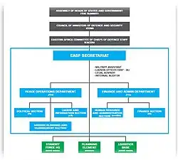 The Eastern Africa Standby Force (EASF), formerly Eastern Africa Standby Brigade (EASBRIG), is one of the five regional forces for Peace Support Operations (PSOs) of the African Standby Force, consisting of military, police and civilian components. EASF constitutes the regional operational arm of the peacekeeping elements of the African Peace and Security Architecture, put in place by the 2002 Protocol Relating to the Establishment of the Peace and Security Council of the African Union.[1][2]
