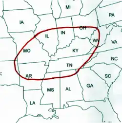 The region of this early agriculture is in the middle Mississippi valley, from Memphis north to St. Louis and extending about 300 miles east and west of the river, mostly in Missouri, Illinois, Kentucky, and Tennessee. The oldest archaeological site known in the United States in which Native Americans were growing, rather than gathering, food is Phillips Spring in Missouri.[21] At Phillips Spring, dating from 3000 BCE, archaeologists found abundant walnuts, hickory nuts, acorns, grapes, elderberries, ragweed, bottle gourd, and the seeds of Cucurbita pepo, a gourd with edible seeds that is the ancestor of pumpkins and most squashes. The seeds found at Phillips Spring were larger than those of wild C. pepo. The agency for this change was surely human manipulation. Humans were selecting, planting, and tending seeds from plants that produced larger and tastier seeds. Ultimately, they would manipulate C. pepo to produce edible flesh.[22]