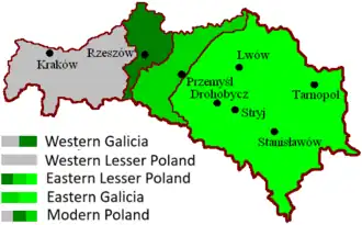 In territorial terms, Eastern Lesser Poland was not fully identical to Eastern Galicia during the Austrian Partition. As a result of the administrative division of the former Austrian Partition territories included in the Second Polish Republic as defined on 23 December 1920,[9] the border of Eastern Lesser Poland in relation to Eastern Galicia was moved significantly to the west.[10] The following counties were incorporated into the Lviv Voivodeship: Tarnobrzeg, Rzeszów, Łańcut, Nisko, Kolbuszowa, Przeworsk, Strzyżów, and Krosno were previously parts of the Lviv appellate court district, the western border of which was the conventional border of Eastern Galicia within Austria-Hungary.[11][12] The north-western border of Eastern Lesser Poland was marked by the Vistula near Sandomierz.