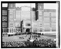 The new Eastern High School building, built by the Charles H. Tompkins Company Incorporated in 1923, was situated at 17th and East Capitol Streets N.E. Charles R. Hart, who was principal of Eastern High School from 1918 to 1945 led the school during its new building construction. In memory of the alumni who died in the Spanish-American War and World War I, a memorial flagstaff was erected in front of the building. The old Eastern High School building was eventually demolished to make way for Hine Jr. High School. When the students moved to the new facility, the enrollment exceeded 1,000. As the surrounding neighborhood of Eastern High School continued to grow, the school's capacity reached 3,000 students by 1934. To address the overcrowding issue, students who lived east of the Anacostia River were redirected to Anacostia High School.[13][12]
