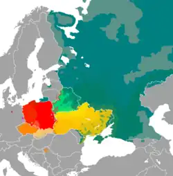 Of the West and East Slavic languages more words seem to have entered Ukrainian, mostly at a dialectal level, though the Moldavian dialect: fryka <frică (fear), pizma < pizmă (envy), korkobec’< curcubetă (pumpkin), part’ < parte (part), harmasar < armăsar (stallion), plačynda < plăcintă (pie), and tajstra < traistă (shoulder bag).[14] More words can be found in the Hutsul dialect: blynda < blândă (mole, birthmark), cara < țară (country), flekew < flăcău (boy, young man), geuzura< gaură (hole), kapestra < căpăstru (halter, bridle), malaj < mălai (corn, old meaning millet), pomana < pomană (dole, alms), tjar < chiar (just, even), zgarda < zgardă (dog collar).[15]