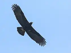 In flight, the eastern imperial eagle is a large raptor that has for an Aquila a very projecting neck and "huge" head and bill.[14][25] The long wings may appear fairly broad when compared to other, smaller raptors, but are relatively narrow with even parallel edges when compared to other Aquila eagles.[26] Their flight style is relatively heavy but steady with deep powerful beats but they are not uncommonly clumsy at first takeoff.[14] They tend to soar with forward pressed but rather flat wings, the outer wing feathers may sometimes curve up but as a rule they do not fly with a V as do some other Aquila. The species may also hold their wings flat while engaging in a glide but as it accelerates they may arch wings back. In flight, the adult from above shows dark brown with small white braces, greyish tail with fine dark bars and a very broad, blackish subterminal band. The adult is essentially all dark colored when seen from below relieved only by some very dusky grey flight feathers on the primaries (against the black wing tips), a grey crissum and thinly barred grey tail base. However, these features may be only obvious in good light and at reasonable distances.[26][29][30] In flight, the juvenile is largely pale buff with brown streaking. The lower back, rump, tail coverts and leg feathers are all whitish cream in colour which contrasts noticeably with their white-tipped blackish greater coverts, primary coverts and quills. On their mantle, juveniles manifest two white wing bars above and a narrow whitish lower trailing edge. Meanwhile, the juvenile's inner primaries are much paler creamy-buff hue than their other flight feathers. The dusky brown wing linings of the juvenile plumage, when compared to the darker ones of adults, show more extensive coarse patterning. Some birds by 2nd to 3rd year are so worn in their flight feathers as to appear almost unstreaked sandy while, from the 3rd year on, darker feathers start to appear below with various untidy variations.[14][29][26]