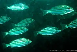 The eastern striped grunter is found at depths of 1 to 30 metres (3.3 to 98.4 ft) and are found in schools in sheltered seagrass beds, sandy areas and in coastal reefs. It is most numerous in weedy areas close to the mouth of estuaries.[1] The juveniles inhabit seagrass beds, moving into them after ending their larval stage.[4] It is an omnivorous species[2] but the major part of its diet comprises small fishes and invertebrates.[3] The eggs are guarded and fanned by the male.[2]