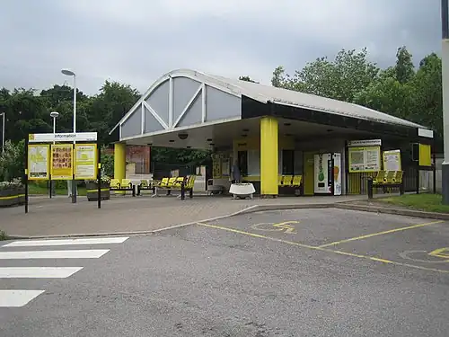 The station is staffed, during all opening hours, and has platform CCTV.[2] There is a payphone, a vending machine and a booking office. There is an Amazon Locker at the booking office under the name 'pravin', which is accessible 24/7. There are departure and arrival screens, on the platform, for passenger information. Each of the two platforms has sheltered seating. There is a free car park with 101 spaces, a cycle rack with 6 spaces, and a secure cycle locker with 44 spaces.[3] Access to the station booking office is on the pavement. Access to each of the two platforms is by a stepped ramp. This allows relatively easy access for passengers with wheelchairs or prams.[4]