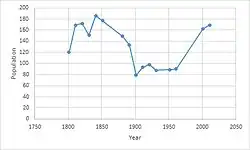 In 1801, the population of Easton was 120 people:[8] 57 males and 63 females,[9] drastically increasing to 172 people:[8] 82 males and 90 females by 1821.[9] The population then fluctuated for the next fifty years, peaking at 186 people:[8] 95 males and 91 females[9] in 1841 and lulling at 133 people:[8] 70 males and 63 females[9] in 1891. Only ten years later, by 1901, the population had dropped to only 79 people:[8] 42 males and 37 females[9] before increasing again to 93 people:[8] 45 males and 48 females[9] in 1911 and remaining between a population of 93 to 98 people until 1961.[8] At the time of the 2001 census, the parish's population had greatly increased to 162: 80 males and 82 females across 60 households.[10] However, by 2011, the population had increased only slightly to 169 people: 83 males and 86 females across 65 households.[11]