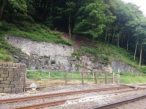 Eastwood Railway Station served the village of Eastwood in the civil parish of Todmorden, West Yorkshire, England. The station opened with the line on New Years Day 1841 and was closed on 3 December 1951 by British Railways. Retaining walls in the cliff above the site, together with a substantial road access ramp, and the remains of adjacent coal drops can still be seen. In addition, the former vehicle-size level crossing has survived in reduced form, as a pedestrian crossing.