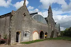 The barn covers 1.25 acres (0.51 ha) with 5 bays to the main facade. Cast iron pillars support the brickwork and wagon roof.[5] It contained several feed stores, two bullock yards with fountains, a flax mill, cider press and threshing machine. The machinery was powered by a water mill which was replaced by steam, oil and diesel engines.[6]