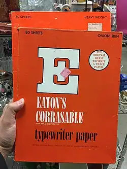 In the United States, Eaton's Corrasable Bond was a very familiar brand of erasable typing paper during the mid-1950s and 1960s, and "corrasable" became almost a generic name for erasable typing paper. For example, in prohibiting the use of such paper for manuscript submissions, the Linguistic Society of America refers to "Eaton's 'Corrasable Bond' and similar brands."[3]