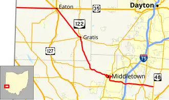 State Route 122 (SR 122) is an Ohio state highway which runs from the Ohio-Indiana state line in Preble County east of Eaton, Ohio to SR 48 near Lebanon, Ohio, a distance of 43.4 miles (69.8 km). When the route was designated in 1923, it ran along its current route from Indiana to Middletown.[2][3] It was extended to its current eastern terminus in 1937 but was extended further east to U.S. Route 42 in 1946.[4][5] The route was truncated back to SR 48 by 1985 with the former section being renamed "Old State Route 122" and maintained by Warren County as CR 230.[6][7][8] The route also used to continue west of the Indiana state line as Indiana State Road 122 west to its terminus at US 27 east of Abington, Indiana.