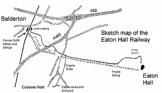 The Eaton Hall Railway was an early 15 in (381 mm) gauge minimum-gauge estate railway built in 1896 at Eaton Hall in Cheshire. The line, which connected the Grosvenor estate with sidings at Balderton on the GWR Shrewsbury to Chester Line about 3 miles (4.8 km) away, opened in 1896. It was built for the Duke of Westminster by Sir Arthur Percival Heywood, who had pioneered the use of 15 in (381 mm) gauge with his Duffield Bank Railway at his house at Duffield, Derbyshire in 1874.